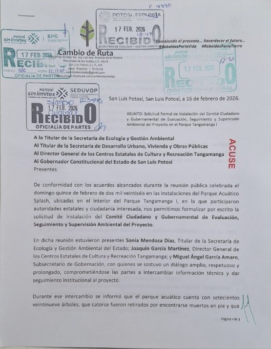 La asociación civil Cambio de Ruta, informó que ha formalizado la solicitud de instalación del Comité Ciudadano y Gubernamental de Evaluación, Seguimiento y Supervisión Ambiental del proyecto “Splash” en el Parque Tangamanga I.